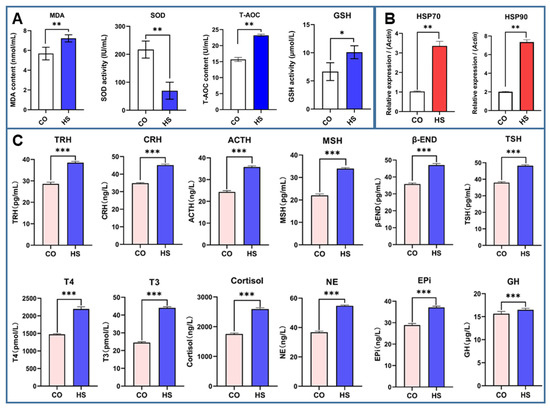 To investigate changes in hormone levels in rainbow trout under heat stress, stress-related hormone levels in rainbow trout serum were measured by ELISA (Figure 1C). It was found that the hypothalamic–pituitary–adrenal (HPA) axis and hypothalamic–sympathetic–chromaffin cell (HSC) axis were activated and the levels of hormones related to stress regulation were significantly increased in rainbow trout. The serum levels of TRH, CRH, ACTH, MSH, β-END, TSH, T4, T3, Cortisol, NE, Epi, and GH in rainbow trout under heat stress were significantly higher than those in the CO group. These results suggest that neuroendocrine function is involved in adaptive regulation in a high temperature environment, and the enhanced activity of neuroendocrine function induced by heat stress may be related to metabolic dysfunction. HSPs are one of the most vital biomarkers of the heat stress response. The relative expression of HSP90 and HSP70 mRNA was significantly increased in the intestinal tissues of rainbow trout under heat stress (Figure 1B). The results further indicated that the heat stress model of rainbow trout was successfully established.
