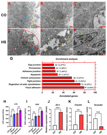 );. (G) The altered intestinal permeability signaling pathways in the HS groups compared with CO groups by enrichment analysis. (H,I). The effect of LPS and DAO in serum and intestinal contents on intestinal permeability was determined by ELISA. (J–L). The relative mRNA expression abundance of ZO-1, Occludin, and Claudin in the intestine was detected by qRT-PCR. The reference gene is β-actin. Data are expressed as means ± SD. **, p < 0.01; ***, p < 0.001 using a one-way analysis of variance (ANOVA) followed by Tukey’s HSD test. CO, control groups; HS, heat stress groups.