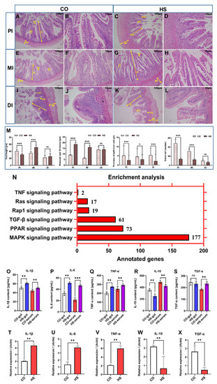 Changes in intestinal inflammatory response under heat stress. (A–L) Morphological changes in the proximal gut, mid gut, and distal gut under heat stress. IV, length of intestinal villi (N = 15); MT, muscular layer thickness (N = 10); ET, the thickness of epithelium (N = 25); GC, goblet cell number. (M) The measured gut IV, MT, ET, and GC, respectively. (N) The altered intestinal inflammatory signaling pathways, by enrichment analysis. (O–S) The levels of cytokines, including IL-1β, IL-6, TNF-α, IL-10, and TGF-α, in intestinal contents and serum were measured by ELISA. CO-gut, intestinal contents of the control group; CO-serum, serum of the control group; HS-gut, intestinal contents of the heat stress group; HS-serum, serum of the heat stress group. (T–X) The mRNA levels of IL-1β, IL-6, TNF-α, IL-10, and TGF-α in the intestinal were detected by qRT-PCR. The reference gene is β-actin. Data are expressed as means ± SD. ns, no significance; *, p < 0.05; **, p < 0.01; ***, p < 0.001 using a one-way analysis of variance (ANOVA) followed by Tukey’s HSD test. CO, control groups; HS, heat stress groups.