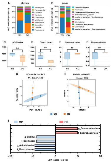 The intestinal commensal microbiota of rainbow trout is altered under heat stress. (A) Changes in the composition of gut microbiota at the phylum levels under heat stress. (B) Changes in the composition of gut microbiota at the genus levels under heat stress. (C–F) Analysis of alpha diversity of intestinal microbiota under heat stress. (C) ACE index; (D) Chao1 index; (E) Shannon index; (F) Simpson index; ns, no significance. (G–I) Analysis of beta diversity of intestinal microbiota under heat stress. (G) PCoA; (H) NMDS; (I) differential bacteria obtained by LEfSe with the threshold of LDA > 4 and p < 0.05. CO, control groups; HS, heat stress groups.