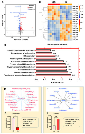 The differential metabolites in the intestinal contents of rainbow trout under heat stress were investigated by UPLC-MC and OPLS-DA. The results showed that the metabolic profile of intestinal contents changed significantly under heat stress (Figure 5A). Compared with the CO group, 357 metabolites (123 up-regulated and 234 down-regulated) were changed in the positive ion pattern. KEGG enrichment analysis showed that the differential metabolites were significantly enriched in glycerophospholipid metabolism, choline metabolism, linoleic acid metabolism, taurine and hypotaurine metabolism, bile secretion, and arachidonic acid metabolism signaling pathways (Figure 5C). The pathways of bile secretion and primary bile acid biosynthesis were most enriched in the intestine of rainbow trout under heat stress. Under heat stress, the abundance of cholesterol in intestinal contents was significantly reduced. On the one hand, the synthesis and secretion of bile acids were decreased, and the process of lipid metabolism was affected. On the other hand, it changed the fluidity of the cell membrane and affected the normal physiological function of the cell membrane.