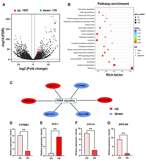 Under heat stress, PPAR-α activation down-regulated target gene cytochrome P450 8B1 (CYP8B1) through the adipocytokine signaling pathway, which affected cholesterol metabolism. It affected lipogenesis by up-regulating the target gene stearoyl-CoA desatu-rase-1 (SCD-1). It also affected the lipid transport process by down-regulating the target genes apolipoprotein A-I (Apo-AⅠ) and apolipoprotein A-Ⅱ (Apo-AⅡ) (Figure 6D–G). These results indicated that the fatty acid production of rainbow trout was enhanced, while the cholesterol metabolism and lipid transport ability were decreased under heat stress.