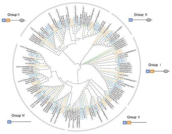 - Zhang, X.; Zhang, L.; Ji, M.; Wu, Y.; Zhang, S.; Zhu, Y.; Yao, J.; Li, Z.; Gao, H.; Wang, X. Genome-wide identification and expression analysis of the B-box transcription factor gene family in grapevine (Vitis vinifera L.). BMC Genom. 2021, 22, 221. [Google Scholar] [CrossRef] [PubMed]