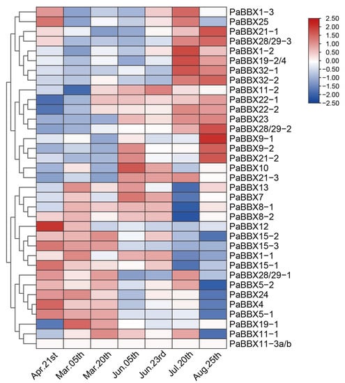 2.5. Transcriptional Profiles of PaBBX Genes during Annual