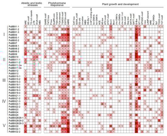 4.5. Putative Cis-Element Analysis of PaBBX Genes Promoters and Intron