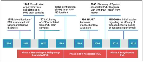 Initial cases of PML, including those published in 1958, were mostly restricted to patients with lymphoproliferative disorders. PML remained an obscure disease until the mid-1980s, as just 230 cases of PML were recorded in the United States between 1958 and 1984 [20,21]. New York City physicians identified the first case of HIV-associated PML in 1982, and during the 1980s, epidemiological studies suggest that the incidence of PML increased nearly 50-fold compared to previous decades due to the spread of HIV/AIDS [22,23,24]. PML became an AIDS-defining illness, and HIV-associated PML is estimated to have occurred in up to 10% of HIV/AIDS cases [25,26,27]. By the mid-2000s, the adoption of highly active antiretroviral therapy (HAART) significantly decreased the incidence and fatality of HIV-associated PML in the United States [23]. While HIV-associated PML is no longer the primary cause of PML, HIV-associated PML still accounts for ~80% of PML cases and causes significant morbidity [24].