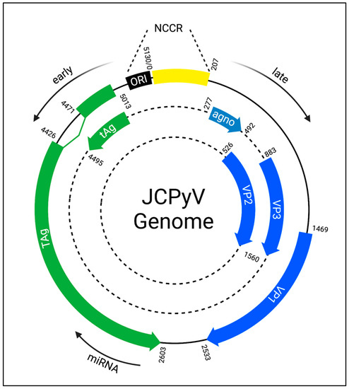 A significant body of work has characterized the genome of many polyomaviruses, including JCPyV and simian virus 40 (SV40); the SV40 genome was one of the first whole genomes synthesized [52]. Like other polyomaviruses, JCPyV contains a small, circular, double-stranded DNA genome of around 5000 base pairs (Figure 2). The JCPyV genome is separated into two segments corresponding to its biphasic replication cycle. The early gene segment, which is transcribed first, codes for large T-antigen (TAg), small t-antigen (tAg), as well as T-antigen splice variants. The late gene segment codes for the structural capsid proteins viral protein (VP) 1, VP2, and VP3, agnoprotein, and a regulatory microRNA (miR-J1) [53]. These distinct segments are separated by a non-coding control region (NCCR) containing an origin of replication, enhancers, and promoters organized into genomic blocks that are named alphabetically. Viral gene expression is regulated by complex interactions between host transcription factors, viral proteins, and the NCCR [54,55]. Transcription of each segment occurs in the opposite direction. Interestingly, while the early and late genes are organized into discrete genetic regions, the late miR-J1gene is encoded within the early TAg gene but is transcribed in the opposite sense [56]. The actions of these viral proteins as well as their potential as therapeutic targets are discussed in the following sections.