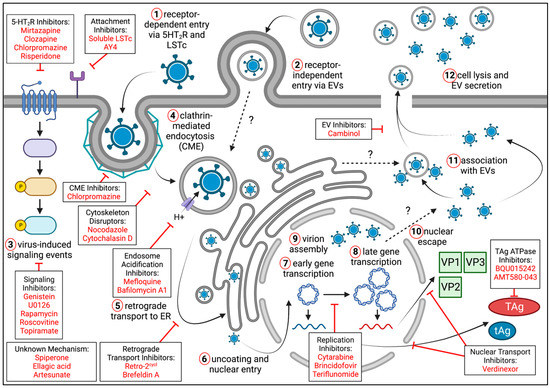Events of the JCPyV lifecycle, including representative inhibitors of virus infection and spread. JCPyV may enter target cells as free virus through receptor-dependent mechanisms (1) and when associated with extracellular vesicles (EVs) through receptor-independent mechanisms (2). Virus-induced signaling events (3), which differ between cellular contexts, support JCPyV replication and occur immediately upon virus binding and internalization. Free virus (and potentially EV-associated virus) is internalized via clathrin-mediated endocytosis (4). JCPyV then undergoes retrograde transport to the ER (5), where virus is uncoated and released back into the cytoplasm (6). After entering the nucleus, JCPyV gene expression occurs in two discrete phases. Transcription of early phase genes (7) produces the potent oncoprotein large T-Antigen (TAg) and small t-Antigen (tAg). Late-phase gene expression (8) generates the structural proteins VP1, VP2, and VP3, which are imported back into the nucleus for virion assembly (9). JCPyV escapes the nucleus via an unknown mechanism (10) and may associate with extracellular vesicles (11). After sufficient virion production, the host cell lyses (12), releasing free virus and JCPyV-associated EVs. Representative inhibitors, including the impacted stage of the virus lifecycle, are shown in boxes. Created with BioRender.com.