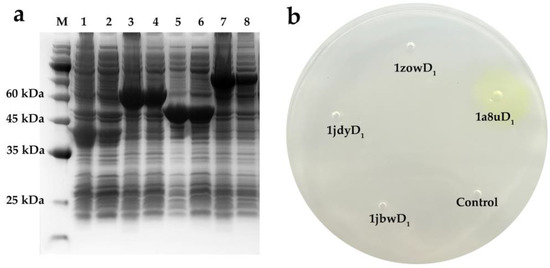 Genes encoding for the four designed enzymes were codon-optimized using the codons preferred for high-level expression in E. coli and cloned into a pET-28a (+) vector for expression in E. coli BL21 (DE3). As shown in Figure 3a, the target proteins were effectively detected in the cell lysate of the four designed enzymes. Although inclusion bodies were formed, the selected designs (1a8uD1, 1jbwD1, 1jdyD1, 1zowD1) could be efficiently soluble expressed in E. coli. In addition, the peptide sequences of in silico designs excised from the blue-stained gel were identified by Nano LC-MS/MS to further verify the correct expression. As described in Tables S2 and S3, the total number of unique peptides recovered from the designed enzymes (1a8uD1, 1jbwD1, 1jdyD1, 1zowD1) were 14, 22, 45 and 14, which respectively accounted for 44.44% (124 out of 279 amino acids), 65.02% (277 out of 426 amino acids), 76.51% (430 out of 562 amino acids) and 72.76% (227 out of 312 amino acids) of the sequence. The activity was qualitatively assessed by observing the chromogenic phenomenon during the hydrolysis reaction of the pNP ester. As shown in Figure 3b, the pore with 1a8uD1 and its surrounding area turned yellow, showing a measurable hydrolysis capacity towards the pNP octanoate. However, there was no coloration in or around the holes with the addition of control samples or the designed enzymes (1jbwD1, 1zowD1 and 1jdyD1), indicating no hydrolytic activity.