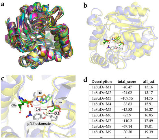 A theoretical conformer ensemble of pNP octanoate superimposed over the carbonyl carbon was shown in Figure 2a. The substrate rotamers together with the structure of theozyme were converted to a constraint file (Doc1 in the Supplemental Material), which can be recognized by the Rosetta program. Then, RosettaMatch was employed to output the grafted models by searching for protein backbones to accommodate the theozyme in a set of 1208 protein scaffolds from EzCatDB database, as listed in Table S1. The initial calculations indicated that the positions providing a more stable environment for the catalytic residues could be found for the theozyme rearrangement (Figure 2b). Afterwards, the RosettaDesign application outputted the refined models (Figure 2c,d). During the process, the Rosetta energy function and conformational sampling of the side-chain rotational isomers with flexible backbones were used to redesign the binding sites of the pNP octanoate. By changing the residues around the above-matched ligands, the functional interaction between the catalytic residues and the substrate was optimized and the affinity for the ligand was improved [21]. Meanwhile, the top 10 ranked designs were used as the input file for the next round of sequence design, and the process was reiterated until the sequence was almost unchanged in five consecutive designs [29]. Consequently, based on the final penalty scores for the constraints (Figure 2c) and visual inspection of the designed structures (Figure 2d), a small number of top-ranked sequences (1a8u-based lipase, 1a8uD1; 1jbw-based lipase, 1jbwD1; 1jdy-based lipase, 1jdyD1; 1zow-based lipase, 1zowD1) were chosen for experimental verification.