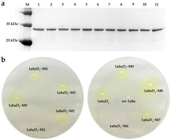 Experimental data of the redesigned enzymes. (a) SDS-PAGE of the redesigned 1a8uD1 using 15% precast mini polyacrylamide gel. Lane M: standard protein molecular weight; lane 1: wt–1a8u; lane 2: 1a8uD1; lane 3: 1a8uD1–M1; lane 4: 1a8uD1–M2; lane 5: 1a8uD1–M3; lane 6: 1a8uD1–M4; lane 7: 1a8uD1–M5; lane 8: 1a8uD1–M6; lane 9: 1a8uD1–M7; lane 10: 1a8uD1–M8; lane 11: 1a8uD1–M9. (b) Qualitative analysis of redesigned enzymes according to color change. The holes with active enzymes, and their surrounding area, turned yellow.
