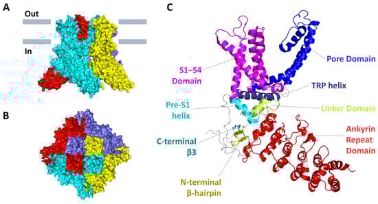 The 3D-structure of mouse TRPV3 in a closed apo-state (PDB: 6DVW). (A) Side and (B) top views of the tetramer protein. Individual subunits are colored in red, cyan, yellow, and slate. (C) The structural organization of a single subunit with domain mapping.