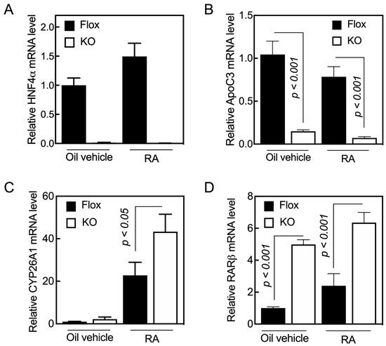 To check the integrity of the Hnf4aF/F;AlbERT2cre mouse line, we measured the mRNA level of several genes as positive controls, including ApoC3 (Figure 1B) and several others (Table S1 and Figure S1, genes for Perp-pending, Rarres2, Rdh5, Rdhe2, Saa4, and RBP4). ApoC3 mRNA expression has been shown to be increased by HNF4α in hepatocytes [31]. We found that the lack of HNF4α in the liver resulted in the suppression of the ApoC3 gene expression by about 80% (Figure 1B). The treatment of mice with RA reduced, although not significantly, the mRNA levels in the liver compared with that in the mice treated with oil as the vehicle control.