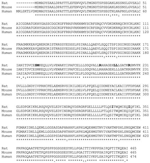 HNF4α is highly conserved among rats, mice, and humans. Alignment of the amino acid sequence of the rat (accession # BAA01411) and mouse (accession # EDL06337) HNF4α protein with that of the cloned human homologue (Zolfaghari and Ross, 2014). The mutated residues based on the model reported for the ligand binding domain of rat HNF4α [35] are highlighted. Asterisks (*) indicate identify and bold type shows the hexameric sequences.