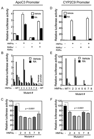 We then tested the transcriptional activity of the individual mutated HNF4α clones compared with that of the WT protein on the promoters of four different human genes in HepG2 cells. These promoters include the APOC3 and CYP2C9 genes, both of which lack RARE but nevertheless respond to RA, and the RARβ and CYP26A1 genes, which, as noted, contain multiple RARE sites [17,18] (Figure 4). Before evaluating the transcriptional activity of the mutated human HNF4α clones, we examined how the human APOC3 and CYP2C9 promoters respond to RA, even though these promoters lack any RARE. For this experiment, HepG2 cells were co-transfected with the individual promoter constructs in pGL3-Basic-luc plasmid vectors together with pRLTK plasmid containing Renilla-luc as the control reporter, and with either WT human HNF4α, RARα/RXRα, or all three transcription factors. Following transfection, the cells were treated with either the vehicle or 1 µM RA for 24 h, after which the cells were assayed for luciferase activity. HNF4α activated the APOC3 promoter by about four-fold and the CYP2C9 promoter by more than 100-fold in HepG2 cells treated with the vehicle (Figure 6A,D). However, RA treatment of the cells reduced the HNF4α-mediated upregulation of the APOC3 promoter by about 38% and that of CYP2C9 by more than 90% (Figure 6A,D). The addition of RA and/or RARα/RXRα in the cells not transfected with exogenous HNF4α also reduced the activity of the promoters of both genes in these cells due to the endogenous expression of HNF4α in HepG2 cells [20].