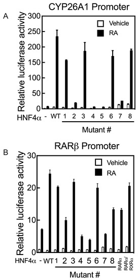 As the promoters of the RARβ and CYP26A1 genes both contain RAREs, they act differently from the promoters of the APOC3 and CYP2C9 genes upon co-transfection with HNF4α and treatment of the cells with RA following transfection. While HNF4α activates the promoters of APOC3 and CYP2C9 genes, their activation by HNF4α is suppressed in cells treated with RA. In contrast, HNF4α activates the promoters of RARβ and CYP26A1 genes in HepG2 cells treated with RA. Mutation of the residues S190 (Mutant #1) and R235 (Mutant #6), each of which has a direct interaction with the carboxyl group of the endogenous fatty acid, resulted in a loss of more than 80% of the transcriptional activity of HNF4α toward the APOC3 and CYP2C9 gene promoters, while most of its transcriptional activity was retained on the promoters of RARβ and CYP26A1, compared with the activity of WT HNF4α (Figure 7A,B). Mutation #3 of the R221 residue, involved in stabilizing the ligand-binding pocket, had little to no effect on transcriptional activity toward the RARβ and CYP26A1 promoters (Figure 7A,B), similar to APOC3 and CYP2C9 genes (Figure 6B,E). Mutation of I-347 (Mutant #7), a residue predicted to maintain the structural integrity of the ligand-binding pocket of HNF4α, resulted in complete loss of its activity toward not only the APOC3 and CYP2C9 genes (Figure 6B,E), but also the CYP26A1 and RARβ genes (Figure 7A,B, respectively). The mutation of four residues, including M191 (Mutant #2), L228 (Mutant #4), L229 (Mutant # 5), and I-355 (Mutant #8), each of which has a direct interaction with the aliphatic chain of fatty acids, resulted in complete loss of HNF4α transcriptional activity toward the APOC3 and CYP2C9 gene promoters (Figure 6B,E). Except for residue I-355 (Mutant #8), mutation of the other three amino acid residues resulted in the loss of HNF4α activity toward the CYP26A1 and RARβ gene promoters (Figure 7A,B, respectively).