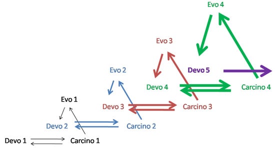 Chapter 10 of the book [14] contains twelve more parts that discuss different aspects of the main hypothesis, including those represented in Figure 1. Evidently, the carcino-evo-devo theory was elaborated around the main hypothesis.