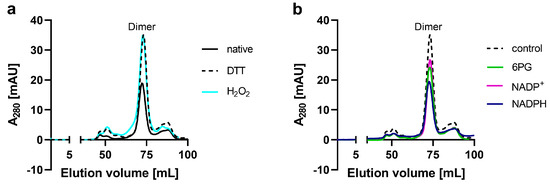 To investigate the oligomerization behavior of Ld6PGD, we performed size exclusion chromatography (SEC) under different conditions. Under native conditions, the SEC profiles of Ld6PGD wt revealed one stable peak representing a molecular mass of 94–111 kDa (Figure 1a), which is equivalent to the dimeric form of the Ld6PGD wt and in accordance with previously published SEC profiles from Leishmania 6PGDs [24,47]. Varying Ld6PGD concentrations did not affect the elution profile (Figure S2). Moreover, the elution pattern of Ld6PGD was neither affected by reductive (5 mM DTT) nor by oxidative conditions (2 mM H2O2) (Figure 1a), suggesting the formation of the dimer is independent from intermolecular disulfide bonds. Most other 6PGDs are active as homodimers and also exhibited a dimer in the crystal structure, such as human 6PGD (Hs6PGD) [48,49,50] (PDBIDs: 5UQ9 [50]; 2JKV, to be published) or 6PGDs from Ovis aries (PDBID: 1PGO [51]), Saccharomyces cerevisiae (PDBID: 2P4Q [52]), Plasmodium falciparum (Pf6PGD) (PDBID: 6FQX [49]), Lactococcus lactis (PDBID: 2IYO [53]), Geobacillus stearothermophilus (PDBID: 2W8Z [54]) or from the related Trypanosoma brucei 6PGD (Tb6PGD) (PDBID: 1PGJ [55]). Hanau et al. [21,56] found that Tb6PGD exists in a dynamic dimer–tetramer equilibrium, which is shifted towards the tetramer in presence of the product NADPH. Therefore, we tested whether the oligomerization of Ld6PGD is similarly affected and performed SEC in the presence of substrates and products. In contrast to the Tb6PGD [56], our studies do not support a dimer–tetramer equilibrium for Leishmania 6PGDs, since the dimer remained unaffected under the conditions tested (Figure 1b).