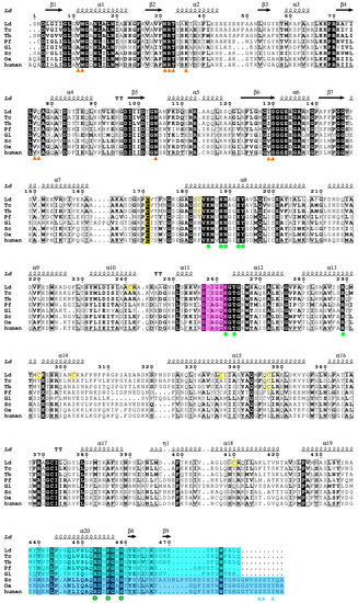 Structure-based multiple sequence alignment of 6PGDs from various species. Shown 6PGD sequences correspond to Leishmania donovani (Ld; acc. no. Q18L02), Trypanosoma cruzi (Tc; acc. no. Q6WAT5), Trypanosoma brucei brucei (Tb; acc. no. P31072), Plasmodium falciparum (Pf; acc. no. Q8IKT2), Giardia lamblia (Gl; acc. no. A8BWM8), Saccharomyces cerevisiae (Sc; acc. no. P38720), Ovis aries (Oa; acc. no. P00349) and Homo sapiens (human; acc. no. P52209). Strictly conserved residues are highlighted with black background, while highly similar residues, with similar physicochemical properties in at least six out of the eight sequences, are shown in bold letters. The secondary structure elements of Ld6PGD (PDBID: 8C79) are displayed above the sequence alignment. Residues of the NADP+ binding site are displayed as orange triangles. Blue triangles correspond to the Hs6PGD sequence and indicate additional residues, which are involved in NADP+ binding. The 6PG binding site comprises residues from both subunits and is therefore displayed as green dots for one subunit and green dots with black outlines for the adjacent subunit. Yellow-colored boxes indicate cysteines of the Ld6PGD structure. Residues of the active site loop (D257-T262) are highlighted in magenta. Residues of the C-terminal domain of protozoan species and multicellular species with elongated C-terminus are highlighted in cyan and blue, respectively. The structure-based multiple sequence alignment was performed using the program ESPript 3.0.