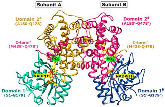 Overview of the Ld6PGD wt dimer. Ld6PGD wt dimer in complex with NADP(H) and phosphate (PO4) is shown in ribbon presentation. The “Rossmann-like” domain 1 (S1-K179) of subunits A (domain 1A) and B (domain 1B) is colored light green and navy blue, respectively. Domain 2 (A180-Q478) of subunits A (domain 2A) and B (domain 2B) is colored gold and magenta, respectively. The C-terminal domain of domain 2 comprises residues M348-Q478. Within the 6PG binding site, a PO4 ion (green) is visible instead of the substrate 6PG. The cosubstrate NADP(H) (yellow) and the PO4 (green) of subunit A and B are shown as stick models.