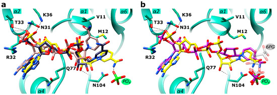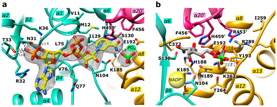 In our Ld6PGD structure, NADP(H) is located at the conserved NADP+ binding site (Figure 4a). The amino acids N31, R32 and T33 interact with one of the phosphates, N31 and N104 with the ribose moieties and the diphosphates are bound by main chain atoms of residues V11 and M12. Via van der Waals forces, I129 and S130 interact with the nicotinamide ring, which is also hydrogen bonded to a phosphate ion. This phosphate ion is located at the same position as the phosphate moiety of homologous 6PG-complexed structures (PDBIDs: 2IYO, 6FQZ) (Figure 4b) and also interacts with homologous strictly conserved residues (Y193, K262, T264, R289 and R453′, H459′ from the adjacent subunit) in a similar manner to other 6PGDs. Moreover, a hydrogen bond (2.6 Å) is visible between the phosphate ion and the nicotinamide ring (N7N atom) of NADP(H). It is known for many 6PGDs that a flexible active site loop adopts an open and a closed conformation depending on substrate binding [49]. The active site loop adopts the closed conformation when the 6PG binding site is occupied by ligands or at least by anions such as phosphate, sulfate or citrate, all of which are capable of interacting with residues of the C-terminal tail. According to this, the active site loop residues (D257-T262) of the Ld6PGD structure, complexed with a phosphate at the 6PG binding site, adopt the closed conformation.