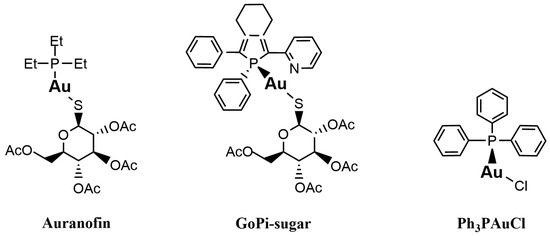Chemical structures of the gold(I)-based compounds auranofin, GoPi-sugar and Ph3PAuCl (chloro(triphenylphosphine)gold(I)).