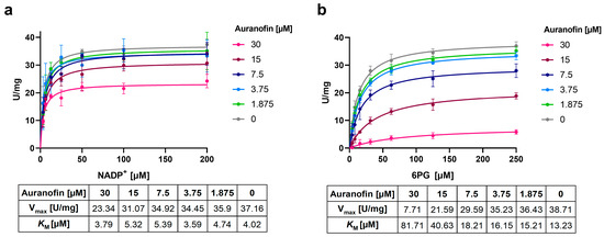 For the mechanistic characterization of auranofin, either NADP+ (0–200 µM) or 6PG (0–250 µM) was titrated at different constant compound concentrations around the IC50 (0–30 µM), while keeping the second substrate in saturation (6PG: 300 µM, NADP+: 200 µM). To determine the compound mode of inhibition, the relationship between initial velocity (v0) and substrate concentrations ([S]) at various constant compound concentrations was analyzed by plotting the data as Michaelis–Menten curves using GraphPad Prism; KM values and Vmax were calculated with GraphPad Prism as well.