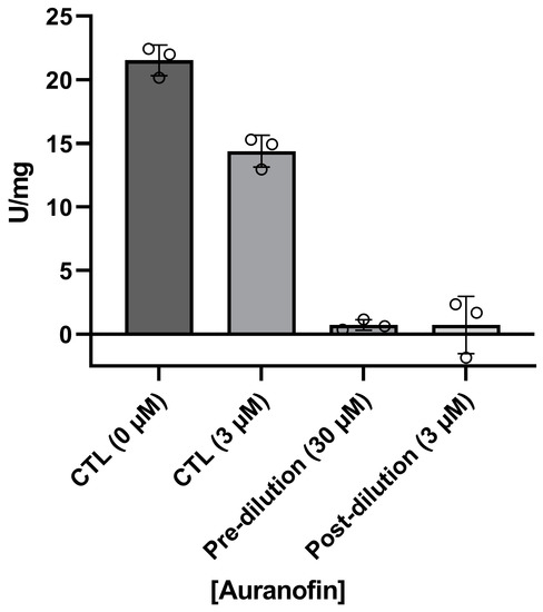In addition, we investigated whether the inhibition of Ld6PGD by auranofin is reversible or irreversible. For this purpose, the enzyme was first incubated with a high concentration of auranofin (pre-dilution, 30 µM), followed by a dilution below the IC50 (3 µM, post-dilution) and incubated again to allow compound dissociation (Figure 8). Compared to controls containing either no auranofin (CTL, 0 µM) or an auranofin concentration equal to the post-dilution concentration (CTL, 3 µM), Ld6PGD activity could not be restored after dilution, indicating an irreversible type of inhibition. This is consistent with previous studies of auranofin and other gold(I)-containing compounds, which also observed irreversible binding of this class of compounds to their targets [41,67,68,69]. The irreversible inhibition of Ld6PGD also explains the ambiguous competitive inhibition mode against 6PG described above. We therefore suggest that the competition of auranofin with 6PG is followed by a rapid irreversible reaction in which a covalent product is formed, explaining why high concentrations of 6PG increase the IC50 but do not abolish the inhibition. Several studies indicated that the true pharmacophore of auranofin is triethylphosphanuidylgold(1+) [Au(PEt)3]+ or simply the gold ion Au(I) alone, rather than the whole auranofin molecule which binds to target proteins, such as TrxR and TR [31,37,41,42,70] or metalloenzymes such as ureases and metallo-β-lactamases [69,71]. In vivo, the thiosugar of auranofin acts more as a carrier ligand and is already displaced by protein thiols or free thiols in the blood. In vitro, selenocysteine or cysteine residues, typically activated by histidines or metal-ions, are necessary to release [Au(PEt)3]+ or Au(I) from the thiosugar or other ligands and enable covalent and thus irreversible binding to the target proteins [37,67,68,69,70,71,72]. Since the active site of Ld6PGD lacks a typical cysteine pair, we investigated whether only the gold moiety is responsible for Ld6PGD inhibition or whether the thiosugar or even the whole auranofin molecule is involved in the MOI. For that purpose, we tested two gold(I)-containing compounds—GoPi-sugar, sharing the thiosugar group with auranofin, and Ph3PAuCl (chloro(triphenylphosphine)gold(I)), an auranofin variant which in contrast lacks the thiosugar group (Figure 6). With 9.4 ± 2.1 µM, the IC50 of GoPi-sugar against Ld6PGD is almost identical to that of auranofin. Interestingly, Ph3PAuCl showed even better activity against Ld6PGD, with an IC50 of 2.1 ± 0.3 µM (Table 3). We suggest that it is again the gold moiety ([Au(PEt)3]+ or Au(I)) that is mainly responsible for the MOI, as it is the only common feature of the three compounds tested. The higher IC50 of auranofin and GoPi-sugar compared to Ph3PAuCl may be due to the large thiosugar, hindering the access to the target site.