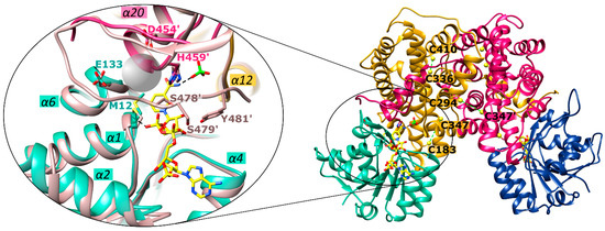 It remains to be determined to which site of the enzyme the gold moiety binds. As described above, Au(I) or [Au(PEt)3]+ of various gold(I)-compounds bind preferentially to cysteines or selenocysteines within the active site of their targets. Therefore, we analyzed the nine cysteines of Ld6PGD, three of which are Leishmania-specific (C241, C294 and C410) (Figure 2). Potential cysteine pairs not found in the human 6PGD are C183-C347, C294-C347′ and C336-C410. However, in the Ld6PGD structure, no disulfide bond is visible between the respective cysteines, and there are no neighboring residues such as histidine and aspartic acid, or alternatively glutamic acid, which could activate the cysteines to covalently bind the gold moiety. In addition, the corresponding cysteines are not in close proximity to the active site, which is why the competitive binding mechanism towards 6PG could only be explained by long chain forces, but this is not evident from the structure. Therefore, based on our kinetic studies, we suggest that the gold moiety binds directly to the 6PG binding site, but by a different mechanism than that previously described. The gold moiety could also be coordinated between M12 and H459 within the 6PG binding site. Asp454 and Glu133 could accept a proton from M12 and H459, providing the necessary negative partial charge to allow the covalent binding to the gold moiety (Figure 9). However, these residues are conserved among 6PGDs, which raises the question of why Ld6PGD and Pf6PGD are efficiently inhibited (Table 3), but the human 6PGD is not inhibited by the gold(I)-compounds we tested. In contrast to protozoan and prokaryotic 6PGDs, 6PGDs from multicellular species, such as from Homo sapiens, Ovis aries, Saccharomyces cerevisiae or from Schistosoma parasites, have an elongated C-terminal domain of about 10–15 residues that could cover the active site and thus sterically prevent auranofin from binding to the 6PG active site. However, while residues S478, S479 and Y481 of Hs6PGD (PDBID: 2JKV) are involved in NADP+ binding (Figure 9), the exact function of this C-terminal elongation or whether it alters its conformation in a substrate-dependent manner is not fully understood. For example, it is fully visible in the NADP+-complexed Hs6PGD structure and covering the active site (PDBID: 2JKV), but it is not visible in all other solved 6PGD structures from multicellular species, whether the substrate and cosubstrate are bound or not (PDBIDs: 4GWG, 4GWK, 1PGJ, 1PGO, 1PGN, 1PGQ, 2P4Q). In addition, there are conflicting studies as to whether the substrates bind by an ordered or random sequential binding mechanism [49,52,59,61,73,74], which could influence the position of the elongated C-terminus and therefore the binding of auranofin.