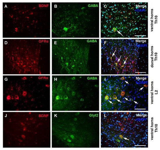 Figure 3. Fluorescent labeling of BDNF growth factor (A,C,J,L; red) and GFRα receptor (D,F,G,I; red) after six weeks of endurance training in specific areas of Th10 and L2 segments of spinal cord. Microphotographs also show the overlapping of these factors with GABA (C,D,I; green) and Glyt2 (L; green) inhibitory neurons (white arrows) (n = 3). Scale bars: (AL), 100 µm.