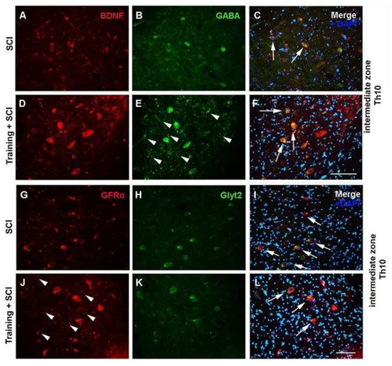 Figure 4. Immunoexpression of BDNF (A,C,D,F; red), GFRα (G,I,J,L; red), GABA (B,C,E,F; green) and Glyt2 (H,I,K,L; green) neurons in nontrained (SCI) and pretrained (T + SCI) groups with Th9 compression. Differences in the experimental groups are shown in the intermediate zone of Th10 segment (just caudally from the lesion site). White arrows indicate the overlapping of BDNF with GABA, GFRα with Glyt2 and DAPI, heads show GABA- and GFRα-immunoreactive puncta (n = 3). Scale bars: (AL), 100 µm.