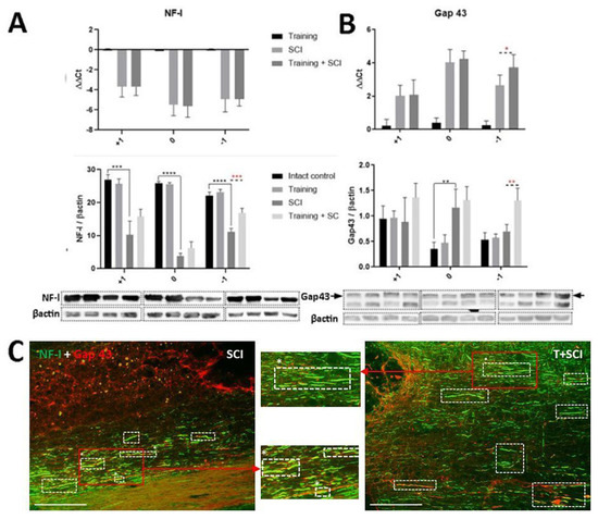 Figure 6. Gene expression, protein level analysis, and fluorescent labeling of light chains of neurofilaments (NF-l) and newly outgrowing fibers (Gap-43) in experimental groups. Levels of ΔΔCt for NF-l, Gap-43, and the ratio of NF-l/βactin and Gap-43/βactin show the effect of endurance training on intact vs. traumatized spinal cord tissue (A,B) (RT-PCR: n = 4, WB: n = 5). Microphotographs show the staining of NF-l (green) and Gap-43 (red) in SCI and T + SCI groups in caudal segment (−1) (C) (n = 3). Red arrows indicate the magnification of representative dashed white squares, showing colocalization of NF-1 with Gap-43. Results are presented as mean ± SD. Data were statistically evaluated using one-way ANOVA and post hoc Tukey’s HSD test; * p < 0.05; ** p < 0.01; *** p < 0.001; **** p < 0.0001. Scale bar: 100 µm.