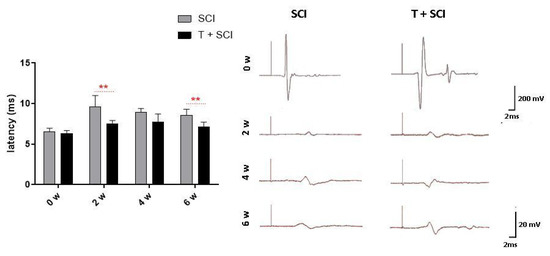 Figure 8. Values of peak latency (ms) recorded from musculus gastrocnemius prior to spinal cord injury (0 weeks) and 2, 4, and 6 weeks after trauma in the SCI and T + SCI groups. Results are presented as mean ± SD (n = 4). Data were statistically evaluated using Student’s parametric t-test; ** p < 0.01.