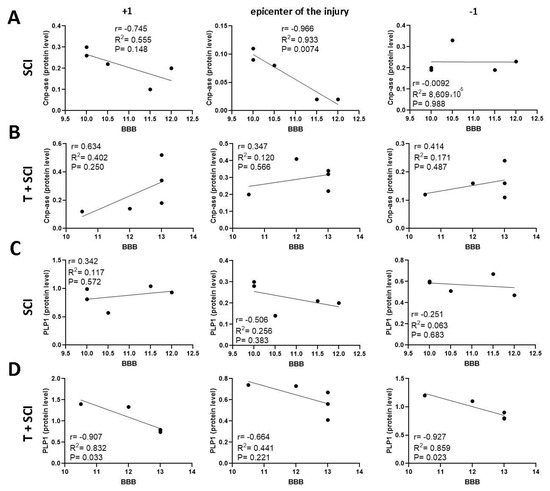 Figure 9. Linear regression analysis of correlation between protein levels for CNP-ase (A,B), PLP1 (C,D), and BBB neurological score (AD) in the epicenter of injury and adjacent segments in SCI and T + SCI groups. Scatterplots of individual values with regression line correlation coefficient (r) and coefficients of determination (R2) calculated using regression analysis and p-Value (n = 5).