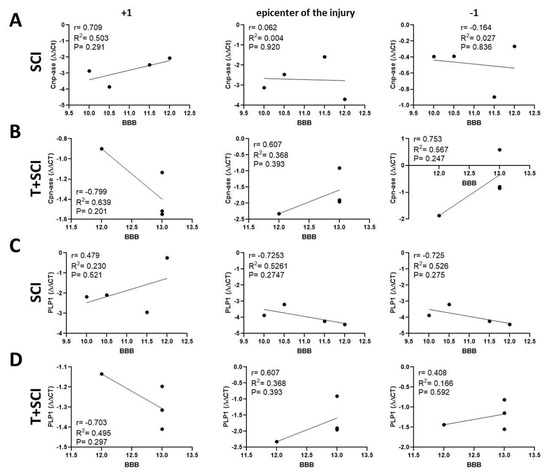 Figure 10. Linear regression analysis of correlation between gene expression for CNP-ase (A,B), PLP1 (C,D), and BBB neurological score (AD) in the epicenter of injury and adjacent segments in SCI and T + SCI groups. Scatterplots of individual values with regression line correlation coefficient (r) and coefficients of determination (R2) calculated using regression analysis and p-Value (n = 4).