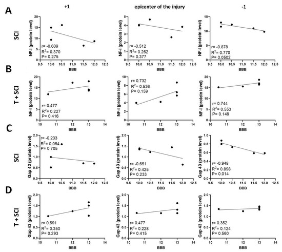 Figure 11. Linear regression analysis of correlation between protein levels for NF-l (A,B), Gap-43 (C,D), and BBB neurological score (AD) at the lesion site, cranial, and caudal segments in Th9 compression groups (SCI and T + SCI). Scatterplots of individual values with regression line correlation coefficient (r) and coefficients of determination (R2) calculated using regression analysis and p-Value (n = 5).