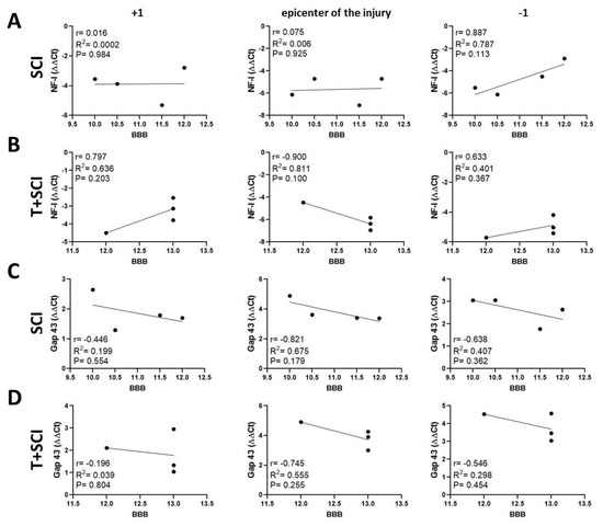 Figure 12. Linear regression analysis of correlation between gene expression for NF-l (A,B), Gap-43 (C,D), and BBB neurological score (AD) at the lesion site, cranial, and caudal segments in Th9 compression groups (SCI and T + SCI). Scatterplots of individual values with regression line correlation coefficient (r) and coefficients of determination (R2) calculated using regression analysis and p-Value (n = 4).