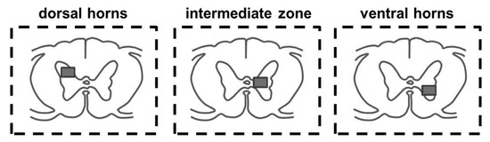 Figure 13. Schematic illustration of the spinal cord showing localization of three areas of interest (dorsal horns, intermediate zone, and ventral horns) for quantitative analysis of GAD 65- and Glyt2-positive cells. Measuring frame size in each area was 1.1 × 1 mm.