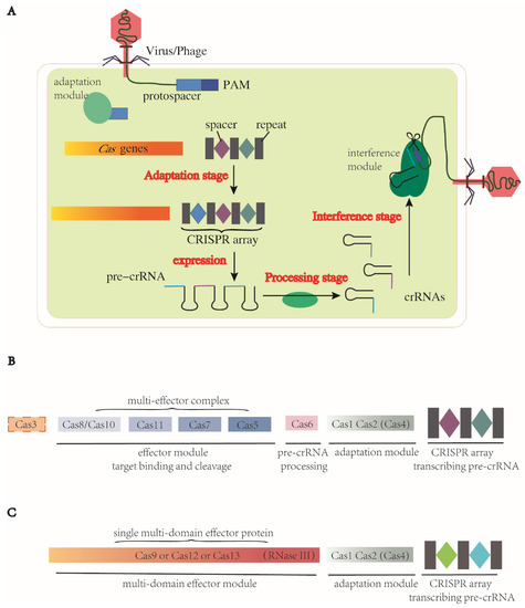 There are three stages in the CRISPR-Cas immune response: adaptation, expression and processing of the precursor CRISPR RNA (pre-crRNA) and interference [42,43], which are the basic mechanisms for the systems to carry out programmable genome editing. Detailed information of the three steps is described below (Figure 1).