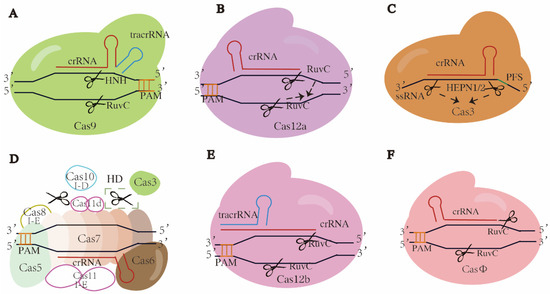 Schematics of typical or promising CRISPR-Cas systems. Cas proteins and crRNAs are targeted at DNAs except in C, which is single-strand RNA. Target sequence recognition is directed by PAM, except in C, by PFS. (A) Class 2 type II CRISPR-Cas9. A Cas9 protein forms a complex with crRNA and corresponding tracrRNA, cleaving dsDNAs at target sites and producing blunt ends. (B) Class II type V CRISPR-Cas12a. Single Cas12a protein forms a complex crRNA and cleaves dsDNA at target site, producing sticky ends. When activated, two RuvC domains would be superimposed and generate ssDNA activity, indicated by the dotted arrows. (C) Class 2 type VI CRISPR-Cas13. Single Cas13 protein forms a complex with crRNA and cleaves single-strand RNA of target gene. When activated, two HEPN domains would come close to each other and generate an active site, indicated by the dotted arrows. (D) Class 1 type I-D CRISPR-Cas10 or type I-E CRISPR-Cas3. In CRISPR-Cas10, Cas10 and Cas3 bind to the Cascade complex containing Cas5, Cas6, Cas7 and crRNA, then Cas10 cleaves and digests dsDNA at target site bidirectionally, indicated by the scissor in dotted box; HD is histidine aspartate. In CRISPR-Cas3, Cas3 is recruited to the Cascade complex containing Cas5, Cas6, Cas7, Cas8, cas11 and crRNA, and digests dsDNA at target sites. All filled patterns are common components shared by both subtypes, while the unfilled patterns are components specific to subtype as noted. The Cas3 in type I-D lacks the nuclease domain. Origins of Cas11 subunits differ between two subtypes, from independent ORF and Cas10d domains, respectively. (E) Class 2 type V CRISPR-Cas12b. Single Cas12b protein forms a complex with crRNA annealing to tracrRNA and cleaves dsDNA at target site, producing sticky ends. (F) Class 2 type V hypercompact CRISPR-CasΦ. Single CasΦ protein forms a complex with crRNA and cleaves dsDNA at target site, producing sticky ends. The scissors refer to where strand was cleaved and blunt or cohesive ends appeared.