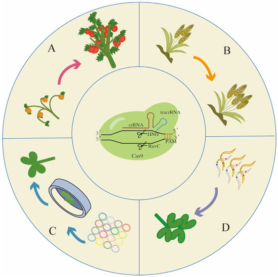 - Zhu, H.C.; Li, C.; Gao, C.X. Applications of CRISPR-Cas in agriculture and plant biotechnology. Nat. Rev. Mol. Cell Biol. 2020, 21, 661–677. [Google Scholar] [CrossRef]