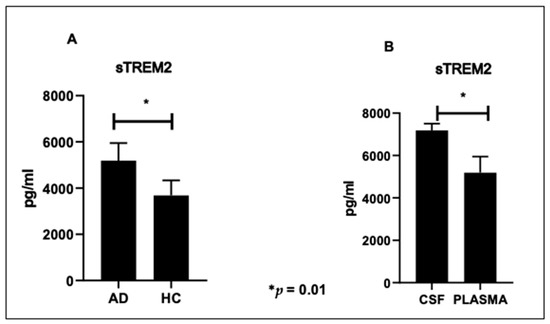 Soluble TREM2 (sTREM2) was quantified in the plasma of HC and AD patients and in CSF of AD alone. Results obtained in plasma showed that sTREM2 was significantly increased in AD (5189 ± 768 pg/mL) compared to HC (3681± 463 pg/mL) (p = 0.01) (Figure 1A). Within the group of AD patients, sTREM2 concentration was significantly increased in CSF (7183 ± 287 pg/mL) compared to plasma (p = 0.01) (Figure 1B).