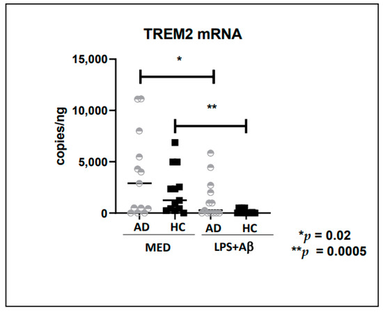 A two-fold increase in TREM2 mRNA expression was observed in unstimulated (medium) monocytes of AD (median = 2488 copies/ng) compared to HC (median = 1230 copies/ng) (Figure 2); this difference approached but did not reach statistical significance. TREM2 was also quantified in CSF of AD patients, but mRNA concentration in CSF was below the limit of detection. Similar results were obtained in LPS +Ab42 stimulated cells.