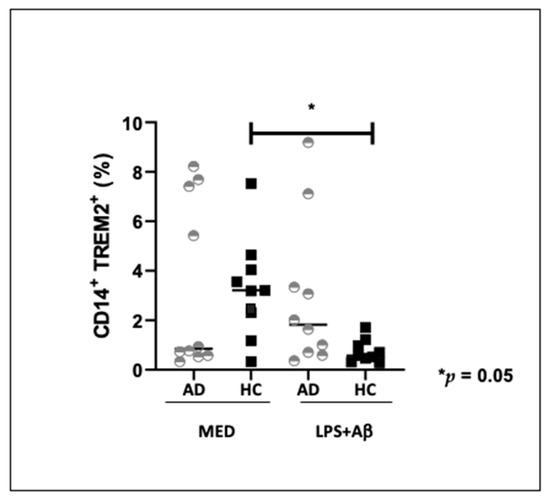 The percentage of TREM2-expressing cells was examined by flow cytometry in a subset of subjects, selected according to the availability of enough cells to run the experiment. Thus, CD14+ immune cells of 10 AD patients and 10 control were either unstimulated or stimulated with LPS and Aβ42 for 24 h. In unstimulated conditions (medium), the percentage of TREM2 expressing monocytes was increased although not significantly in HC (median 3.2%) compared to AD patients (median 0.9%). Interestingly, TREM-2 expression on monocytes of HC was significantly reduced (p < 0.05) when cells were stimulated with LPS + Aβ42, suggesting a negative effect of inflammatory stimulation on TREM2 expression (Figure 3).