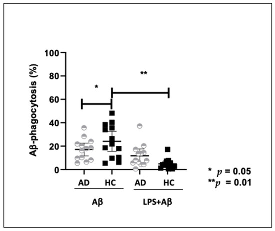 Aβ42-FAM-phagocytosis by Aβ- or Aβ+ LPS- stimulated monocyte of 13 Alzheimer’s Disease patients (AD) and 12 healthy controls (HC). Results are expressed as the percentage of monocytes phagocyting Aβ42-FAM. Analysis was performed by FlowSight. Mann Whitney test was used to compare the phagocytosis percentage in AD and HC and Wilcoxon matched-pair test for comparison before and after LPS stimulus Data are summarized as median and Interquartile (IQR) (25° and 75° percentile). p values of less than 0.05 were considered significant (* p = 0.05; ** p = 0.01).