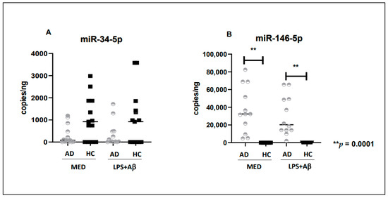 miR-34a-5p (A) and miR-146a-5p (B) expression in unstimulated (MED) or LPS + Aβ42 stimulated-PBMC from 12 Alzheimer’s Disease patients (AD) and 12 healthy controls (HC). The Mann Whitney test was used to compare the mRNA or miRNA expression value in AD and HC and the Wilcoxon matched-pair test for comparison before and after stimuli. For ddPCR analysis, the QuantaSoft software version 1.7.4.0917 (Bio-Rad, Hercules, CA, USA) was used to quantify mRNA and miRNAs copies. Data are summarized as median and Interquartile (IQR) (25° and 75° percentile). p values of less than 0.05 were considered significant ** p = 0.0001.