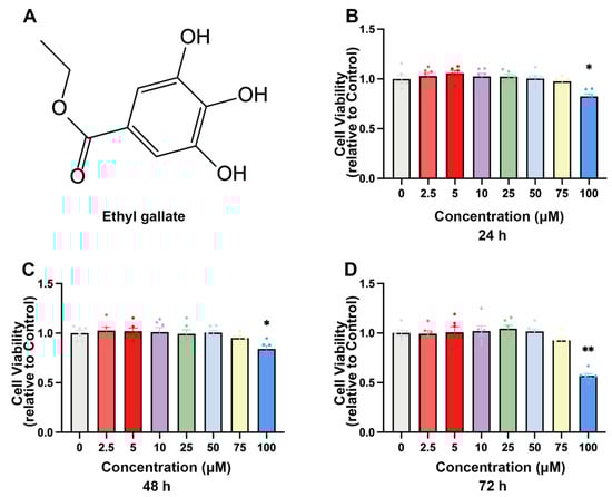 The cytotoxicity of EG on MDBK cells. (A) Chemical structure of ethyl gallate. (B–D) Cell viability was evaluated by CCK-8 assay. MDBK cells were treated with EG 0–100 µM for 24, 48, and 72 h. Data represent mean ± SEM (n = 6). * p < 0.05, ** p < 0.01.