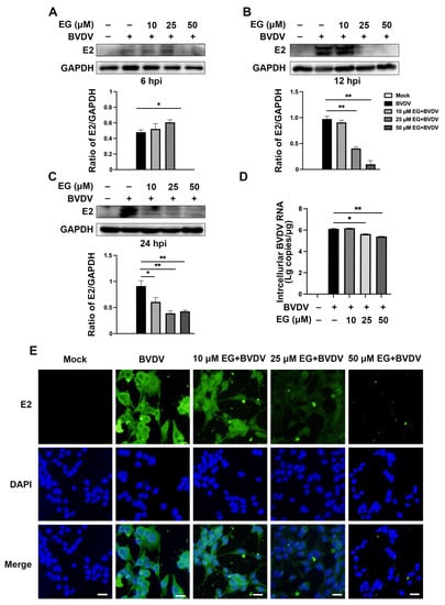 EG inhibits BVDV infection in MDBK cells. (A–C) Cells were infected with BVDV BJ175170 isolate strains (MOI = 1) and treated with different concentrations (0, 10, 25, 50 µM) of EG for 1 h. At 6, 12, 24 hpi, samples were collected and detected by Western blot. (D) The BVDV 5′UTR mRNA level was analyzed by qRT-PCR. Cells were treated with different concentrations (0, 10, 25, 50 µM) of EG for 24 hpi. (E) Cells were treated with different concentrations (0, 10, 25, 50 µM) of EG for 24 hpi. Viral replication was analyzed by Immunofluorescence staining. Scale bar, 50 µm. Data represent mean ± SEM (n = 3). * p < 0.05, ** p < 0.01.