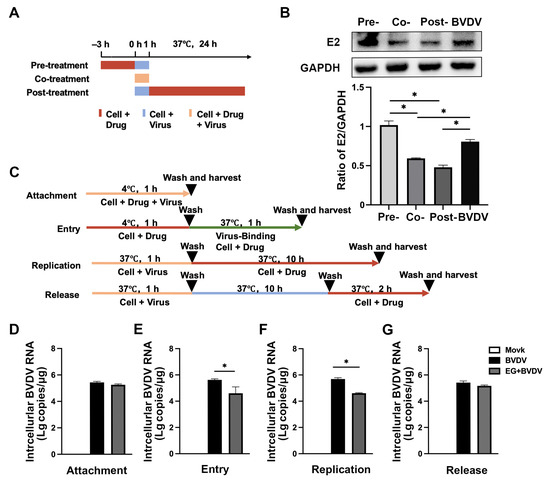 Effect of EG on inhibition of BVDV life cycle. (A) MDBK cells were treated with EG at 50 µM and BVDV (MOI = 1) infection schematic at time of addition assay. (B) The expression of BVDV E2 protein was collected from the cells at 24 hpi and analyzed by Western blot. (C) MDBK cells were treated with EG at 50 µM and BVDV (MOI = 1) infection schematic in the attachment, entry, replication, and release steps assays. (D–G) The BVDV 5′UTR mRNA level was analyzed by qRT-PCR. Data represent mean ± SEM (n = 3). * p < 0.05.