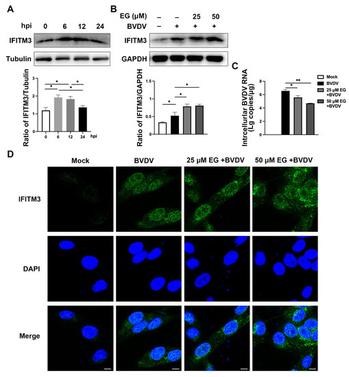EG promotes the production of IFITM3 in MDBK cells infected with BVDV. (A) Western blot analysis of the protein expression of IFITM3 in MDBK cells infected with BVDV (MOI = 1) for 6 to 24 h. (B) MDBK cells were treated with EG at 25, 50 µM after BVDV infection, then incubated for 24 h. The protein expression of IFITM3 was detected by Western blot. (C) The BVDV 5′UTR mRNA level was analyzed by qRT-PCR. (D) The IFITM3 were analyzed by immunofluorescence assay with the antibody against anti-IFITM3 (green) and nuclear (blue). Scale bar, 50 µm. Data represent mean ± SEM (n = 3). * p < 0.05, ** p < 0.01.